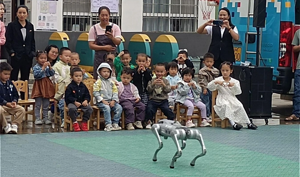 活动现场,机器狗成为孩子们关注的焦点。随着“机器狗来啦!”的欢呼声,灵巧的机器狗闪亮登场。它时而扭动身躯“卖萌”,时而标准地完成“俯卧撑”,甚至还能帅气地“前空翻”,一系列精彩动作引得现场萌娃们惊叹连连、掌声不断。孩子们纷纷围拢上前,与这位科技“萌宠”近距离互动,沉浸式感受人工智能的奇妙魅力。