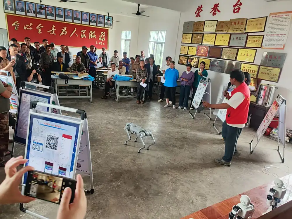 7月10日下午14:30,巡回宣讲队来到迤车镇索桥社区新时代文明实践站,县科协志愿者通过现场操作机器人和机器狗,展示了跳跃、旋转、后空翻等动作,并介绍了我国人工智能发展现状和智能机器人的应用场景,为现场群众带来了一场别开生面的科普体验。科普展示后,志愿者向群众介绍了长期大量饮酒的危害,倡导大家树立“自己是健康第一责任人”的理念,做到健康文明饮酒、不劝酒、不酗酒、饮酒后不驾车。同时,结合真实案例,志愿者解读了国家殡葬改革政策,引导群众转变观念,摒弃大操大办、铺张浪费、焚烧纸钱等陋习,提倡节俭治丧、文明祭扫、生态安葬,以减轻经济负担,保护绿水青山。