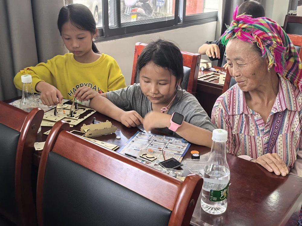 活动现场,线上直播的趣味教学与线下的亲子互动实践巧妙融合。屏幕里,新能源汽车的奥秘娓娓道来;屏幕外,孩子们与家长围坐在一起动手拼图——从零散的部件到完整的车身,从车轮安装到细节拼接,既有父母在旁耐心引导,也有爷爷奶奶手把手带着孩子尝试,一老一小在一次次配合中共同拼出属于他们的新能源小汽车模型。指尖的协作里,孩子们不仅感受到亲子互动的温暖,更在亲手组装的过程中,直观了解到新能源汽车的构造与环保优势。当“自己拼的车”完整呈现时,孩子们眼中闪烁着成就感,也悄然理解了“绿色驱动”与节约资源、环境保护的重要性,在心中种下“科技赋能环保”的种子。