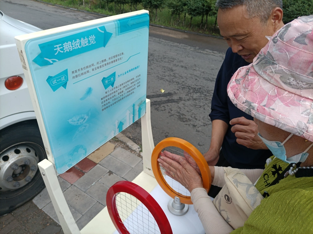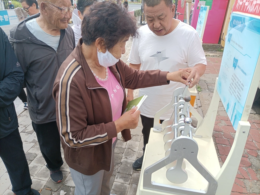 本次活动采用科普展品和宣传展板相结合的形式。活动现场,以科普大篷车为载体带来了10余件互动科普展品,包括磁力传动摆、最速降线、天鹅绒触、懒惰环觉等,涵盖了声、光、电、磁等多个领域。以直观的形式,将原本晦涩难懂的科学知识变得鲜活了起来,让居民们在玩中学,学中玩。新奇的科普展品吸引了众多老年人的参与,大家围在展品周围,亲自动手操作,在互动体验中感受科学的魅力。科普辅导员穿梭在人群中用通俗易懂的语言耐心讲解展品的操作方法以及包含的科学原理,帮助居民深入理解科学知识。