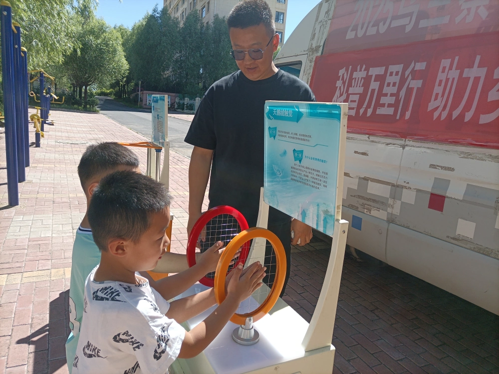 活动充分发挥了科普大篷车传播载体的作用,通过悬挂科普宣传条幅、陈列宣传展板、发放科普宣传手册的形式,向社区的居民们科普日常生活中的科学知识。活动现场,居民们情绪高涨,兴致盎然。新奇的科普展品和醒目的宣传条幅吸引了小区各年龄段居民的目光。老人带着孙辈体验展品,有些孩子们迫不及待的动手操作起来,科普辅导员在旁边指导如何操作,为大家讲解展品背后包含的科学原理。此外,还向居民们发放了关于科学辟谣方面的科普书籍,并向大家科普关于“运动后不能喝冰水,喝冰水有害健康”,“多看绿色可以保护视力”等科学知识。