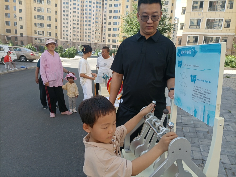 本次活动采用科普展品和宣传展板相结合的形式。活动现场,科普大篷车前整齐排列了10余件涵盖声、光、电、磁等多个领域的科普互动展品,包括懒惰环、磁力传动摆、最速降线、天鹅绒触觉等。以直观的形式,将原本晦涩难懂的科学知识变得鲜活了起来。新奇的科普展品吸引了众多老年人的参与,大家纷纷动手操作,在互动体验中感受科学的魅力。科普辅导员穿梭在人群中,耐心讲解展品的科学方法以及背后的科学原理,帮助居民深入理解科学知识。