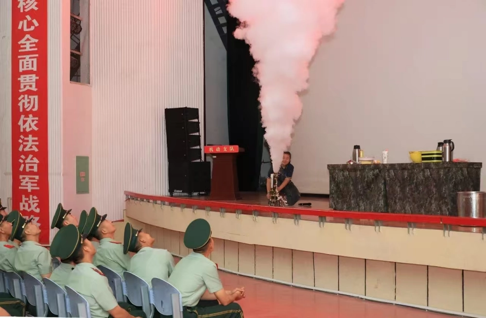 随后的科学实验表演秀,让官兵们更加直观地感受到了科技的神奇魅力。方形的“空气大炮”喷射出环状烟圈;“液氮蘑菇云”实验通过-176℃的超低温液氮与开水相遇,展现了冰与火的剧烈碰撞,视觉冲击力十足;“火焰掌”实验中,丁烷气体在手掌燃烧却不伤皮肤……一个个精彩的实验,引得现场掌声雷动。战士王传龙在观看完科学实验表演秀后说:“这些科学实验不仅具有很强的观赏性,还能启发科学思维,有趣的科学现象背后蕴藏着无穷的科学道理。”