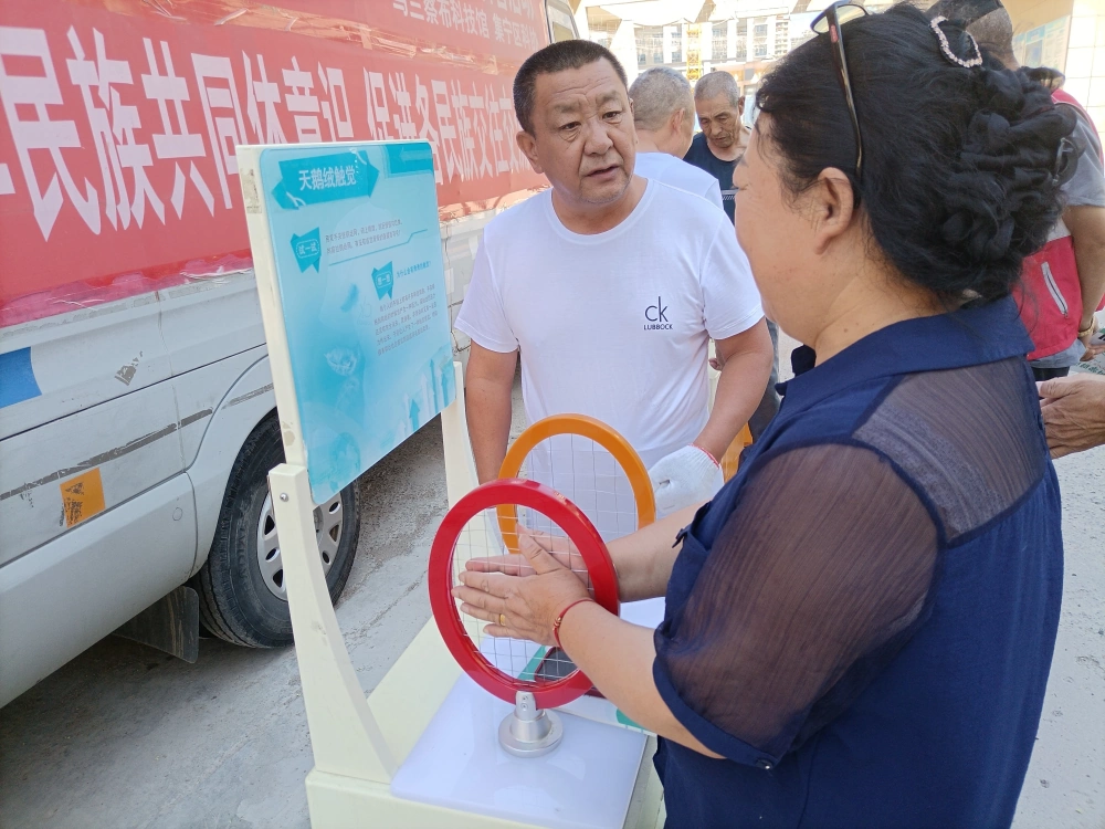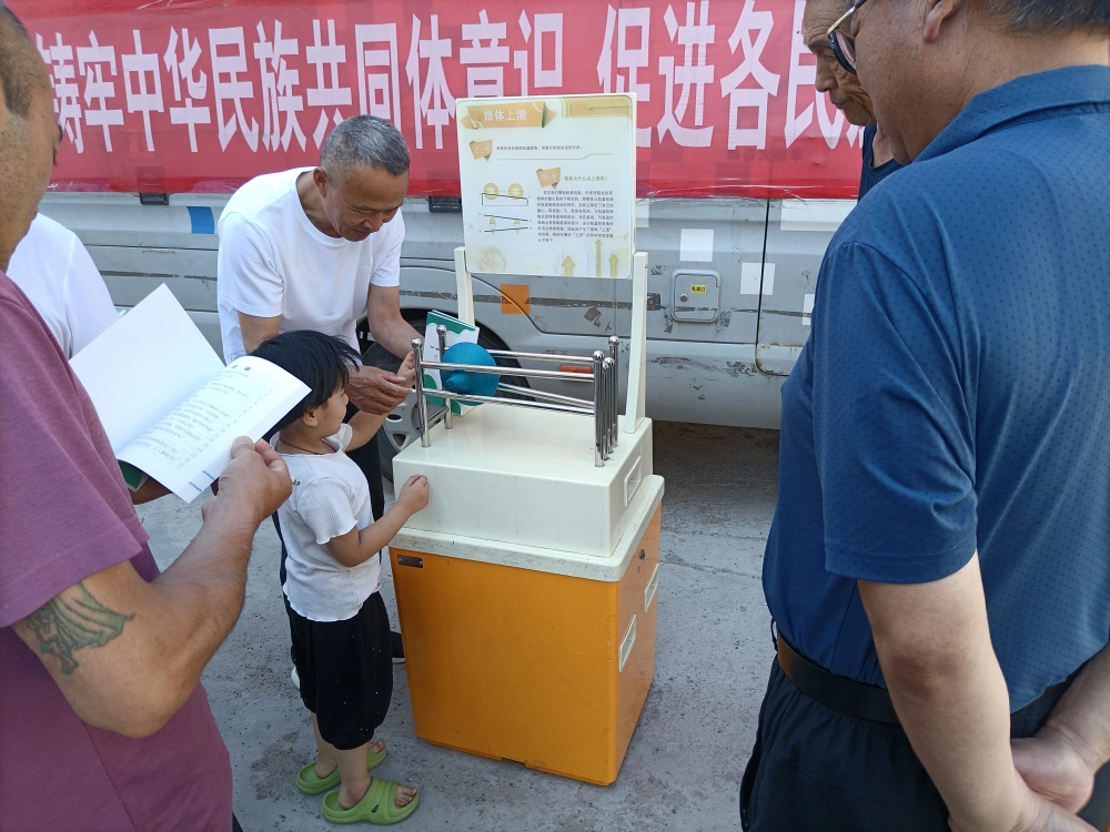 本次活动采用科普展品和宣传展板相结合的形式。活动现场,科普大篷车宛如一个“流动的科学宝箱”,搭载着丰富的科学知识,驶入了小区。大篷车前摆放了10余件涵盖声、光、电、磁等多个学科领域的互动展品,包括懒惰环、锥体上滚、磁力传动摆、看谁跑得快等。社区的老年人在“天鹅绒触觉”这件展品前停下了脚步,互相讨论,询问,为什么双手在铁丝网上来回滑动,会有羽毛般的神奇触感呢,一位大爷提出了疑问。科普辅导员在一旁耐心讲解,用通俗易懂的语言为居民答疑解惑,大家一边操作,一边点头附和,在玩乐中学习科学知识。