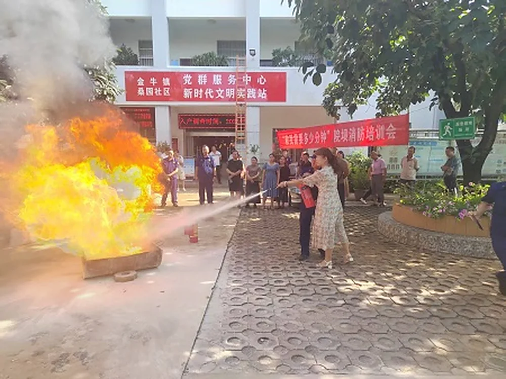 实操环节中,消防员上演“生死时速”,35 秒内完成厚重灭火战斗服的穿戴,令在场居民惊叹不已。随后,参训居民在消防员手把手指导下,轮番体验灭火器“提、拔、握、压” 四步操作,扑救油盆火;学习液化气钢瓶起火时“关阀断气、湿布覆盖”的关键处置方法,确保人人敢上手、会操作。