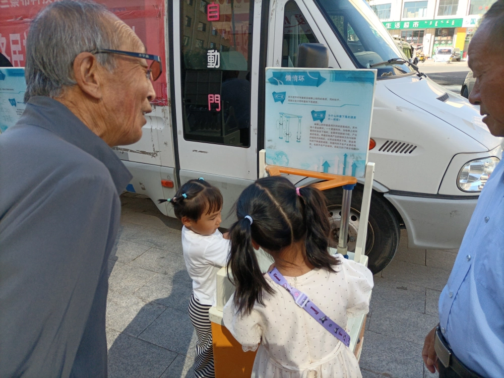 本次活动采用科普展品和宣传展板相结合的形式。活动现场,科普大篷车搭载着10余件科普互动展品,缓缓驶入小区。包括天鹅绒触觉、看谁跑得快、磁力传动摆、锥体上滚……这些互动展品涵盖了声、光、电、磁等各类学科领域,让原本枯燥的科学知识,以更加直观的形式展现在大家眼前。醒目的科普宣传条幅和新奇的科普展品吸引了居民们的围观,大家围在展品前积极讨论,我馆的科普辅导员在旁边用通俗易懂的语言为大家讲解展品的操作方法以及包含的科学原理,大家认真聆听,仔细观察,亲自动手体验科技带给大家的神奇魅力。