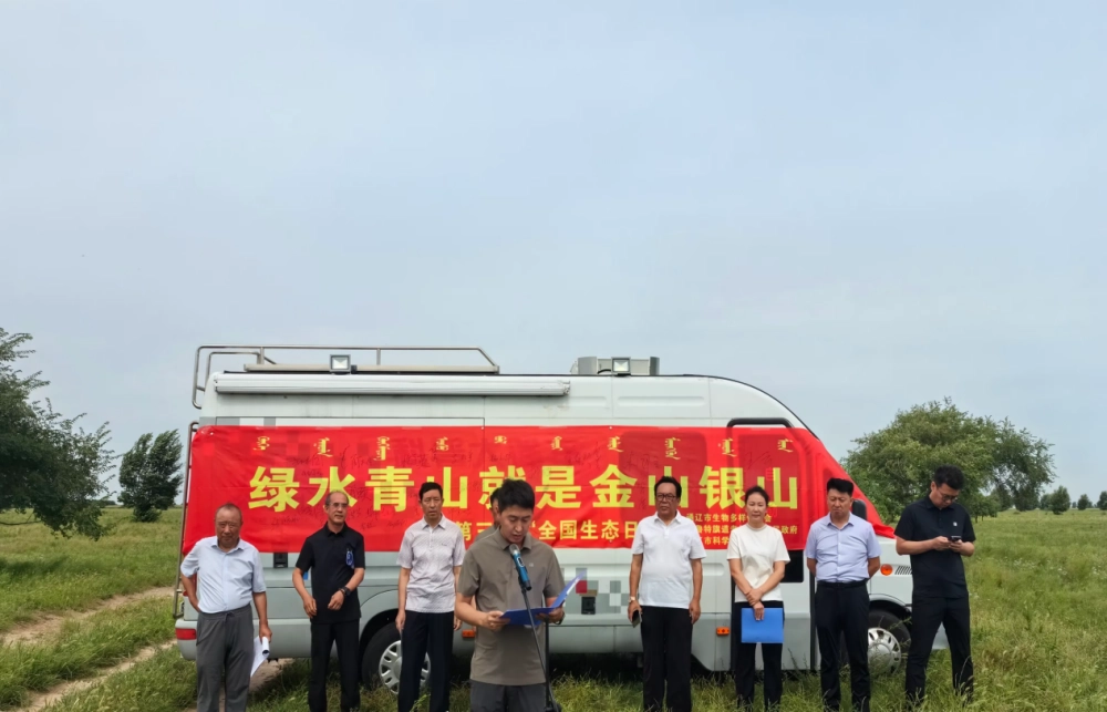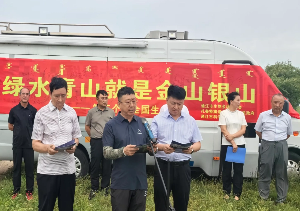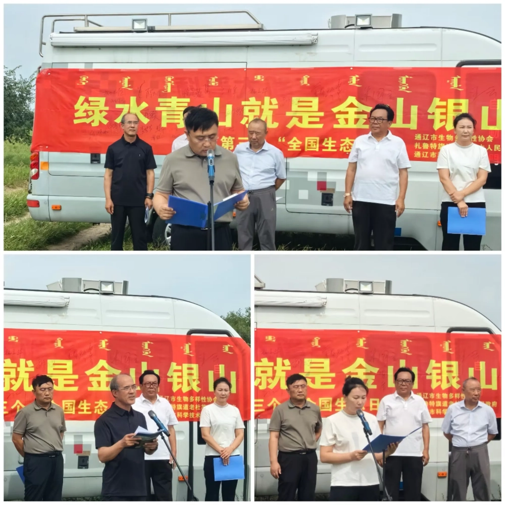 通辽市生物多样性保护协会秘书长董永义、道老杜苏木人大主席鲍高峰、通辽市科学技术馆党支部副书记吉日木图宣读“共同守护草原生态 建设美丽家园”倡议书。