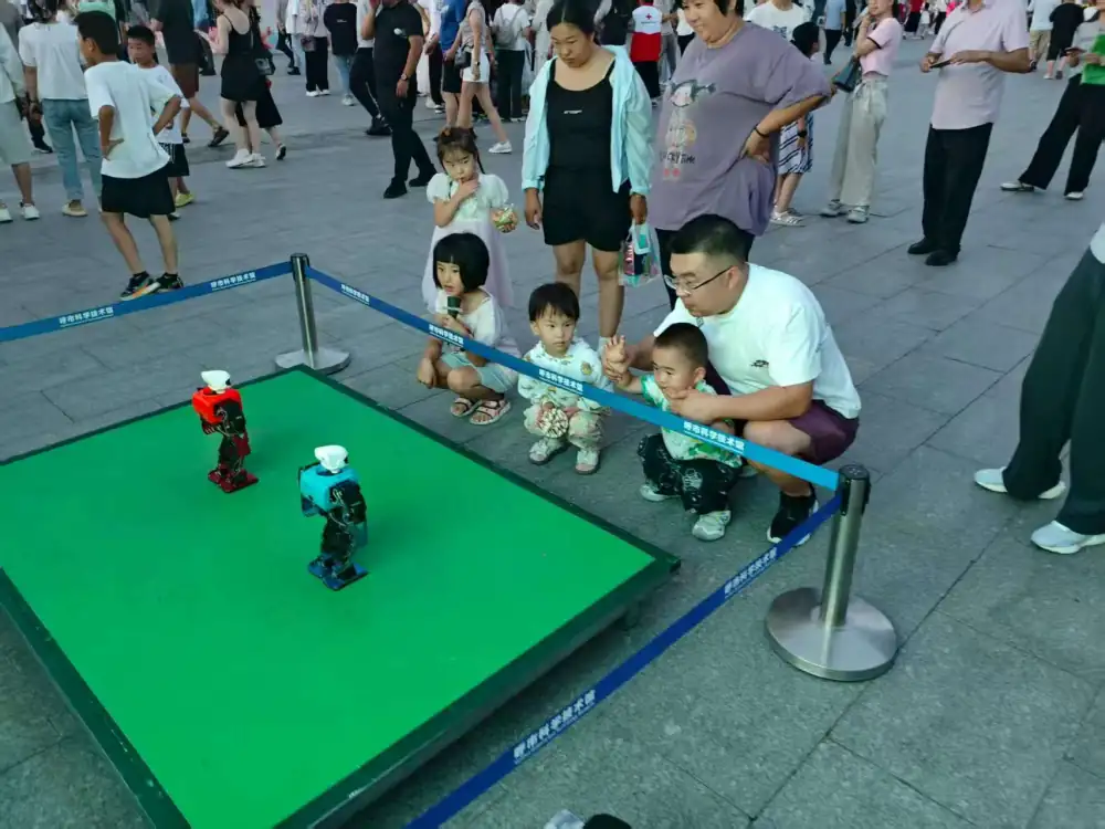 呼和浩特市科技馆把整座城市最鲜活的好奇心,打包装进这辆“移动科学盒子”,送给每一位路过的市民与旅人。智能机器狗翻滚、跳跃与市民和游客朋友们热情的打着招呼,时而发送“比心”手势俘获在场小姐姐的心。紧接着,两台“机甲大师”像从科幻片场穿越而来,肩灯交替闪烁,炮塔旋转间投射出红蓝交织的激光网格。它们时而防守、时而突袭,每一次精准“命中”都引来一阵掌声与惊呼。辅导员在一旁化身“战术解说”,把陀螺仪、视觉识别、自动避障这些听起来高冷的名词,拆解成一句句“原来这就是电影里的黑科技”。