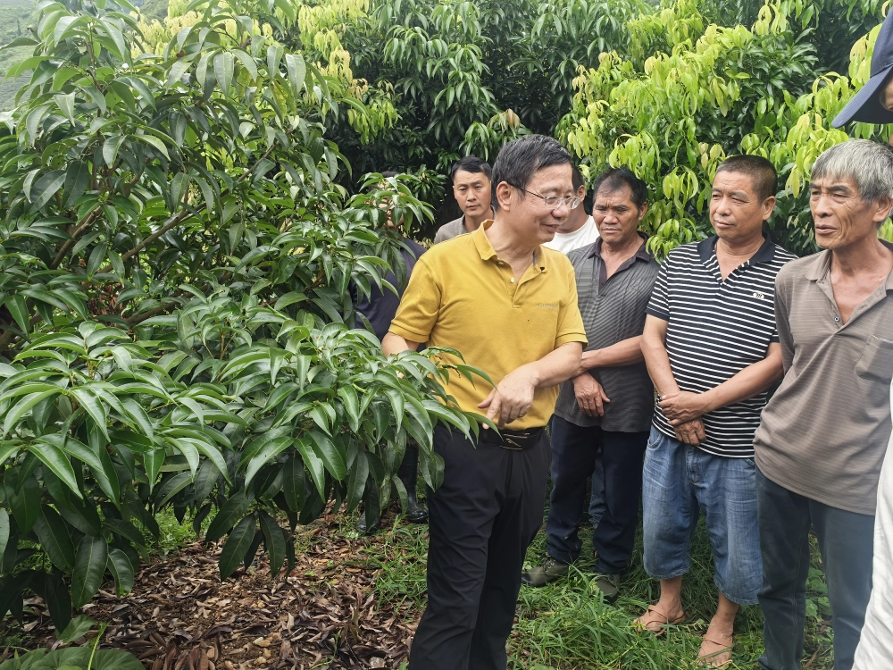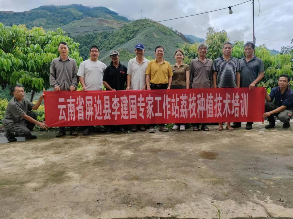 在屏边县白河镇 402 基地里,李建国教授未受阴雨天气影响,纵使雨滴落在身上,也与当地荔枝种植户围坐院坝,以“一对一”座谈的形式,把专业技术送到农户心坎上。