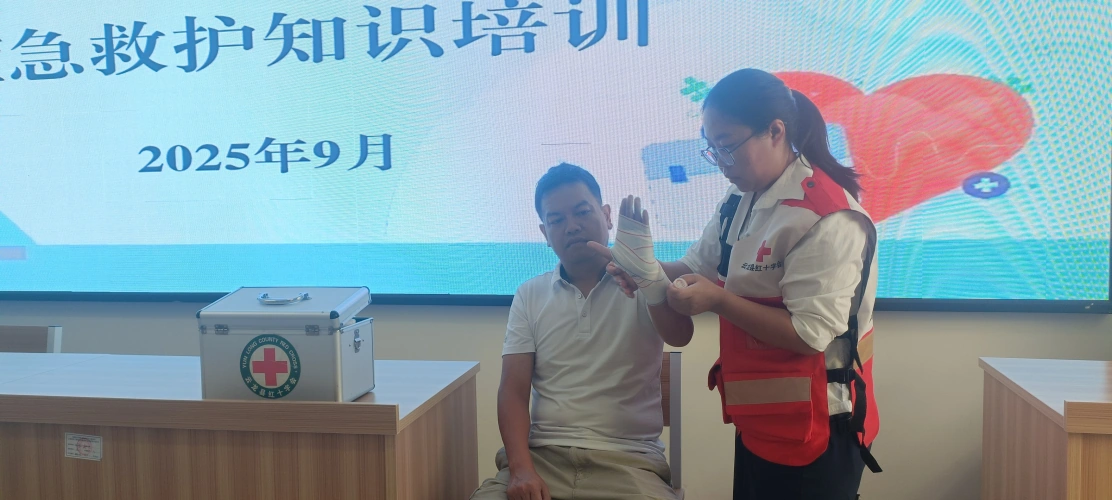 活动采用“理论讲解+实战演练”双驱动模式,由红十字会资深应急救护培训师担纲授课。培训师以触目惊心的真实案例为切入点,着重强调“黄金四分钟”在急救中的生死意义——心脏骤停后每延迟1分钟,生存率下降10%,四分钟内正确施救可大幅提升抢救成功率。在心肺复苏(CPR)和海姆立克急救法教学环节,培训师借助人体模型分步演示关键动作:从快速判断意识与呼吸、精准定位按压点,到胸外按压的力度与频率把控(深度5-6cm,速率100-120次/分),再到人工呼吸的规范操作,每一步都强调细节与力度平衡。面对气道异物梗阻,培训师详细讲解“剪刀-石头-布”手法定位腹部冲击点,并现场邀请学员模拟演练,纠正错误姿势。实操环节中,学员们踊跃参与,在老师“手把手”指导下反复练习包扎技巧——环形包扎、螺旋包扎、8字形包扎……从绷带的松紧度控制到三角巾的灵活应用,从止血点的精准按压到骨折固定的稳固支撑,每一个动作都力求规范到位。“原来包扎看似简单,松紧要适中、覆盖要全面、打结要避开伤口,这些细节太关键了!”一位学员边操作边感叹。