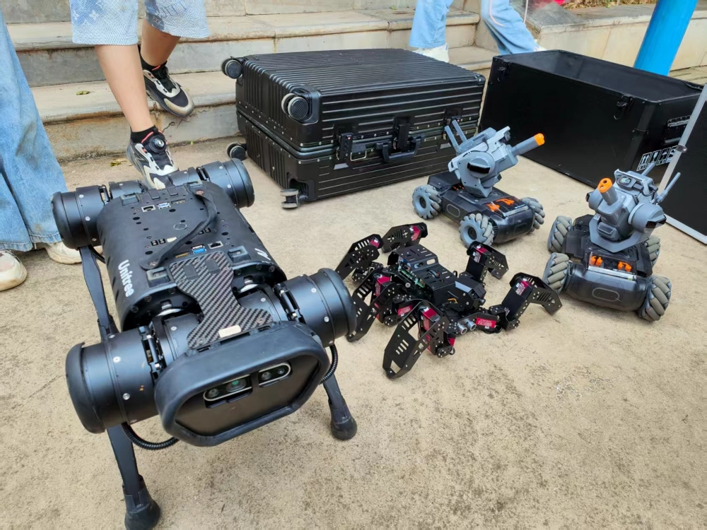 科普大篷车的到来,原本沉寂的校园瞬间被点燃。车里的“科技宝贝”一亮相,孩子们的目光就挪不开了——能飞的无人机、会蹦的机器狗、能对战的机甲大师、像蜘蛛爬的仿生机器人,还有能动手玩的数学思维训练套装,每一样都像“装满科学惊喜的魔法箱”,引得孩子们直往前凑。
