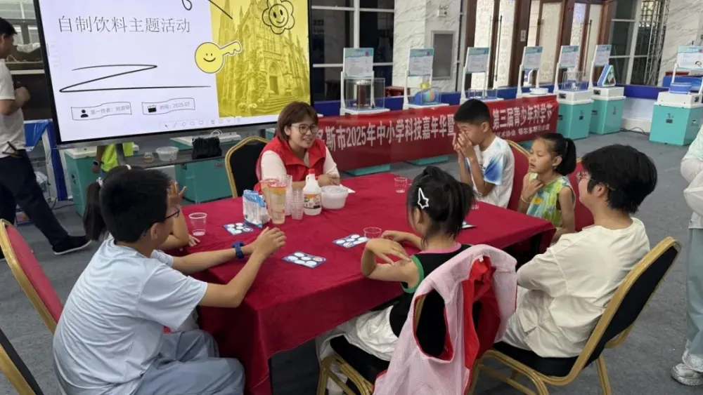 在科技嘉年华现场,科普大篷车不仅带来丰富的互动展品,还开设了特别设计的“科学课”体验环节。课程将“变色游戏”和“制作汽水”两大主题融合,通过动手实验引导学生深入理解化学原理。