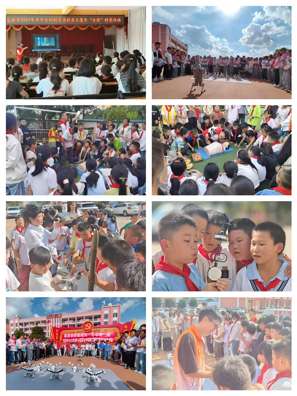 活动中,来自团县委的科普志愿者围绕抗战悲壮历史、祖国壮丽山河、辉煌历史成就等主题进行宣讲,深化国防教育在青少年学生中的渗透力;县妇联科普志愿者向学生们开展预防溺水安全和防范校园欺凌法治科普宣传教育;县红十字会科普志愿者通过人体模型演示心肺复苏急救流程,手把手指导学生进行心肺复苏技能实操。县气象局、地震局科普志愿者向同学们科普气象、地震灾害的认知与防范知识。随后在科普志愿者的引导下参观体验、亲手操作科普展教设备,科普志愿者化身“科学魔法师”,通过“大象牙膏”“火焰掌”等生动有趣且安全易懂的科学实验,直观地向师生们展示了奇妙的科学现象。随着机器狗、机器人登场,系列表演把活动推向高潮。通过这些互动体验式的展品、科学实验秀等,让同学们对科学知识有了更直观的认识和理解,切身感受到科技的无穷魅力,激发了同学们对科学的兴趣。 活动发放铭记历史·缅怀先烈、强我国防、预防溺水、校园霸凌、防范地震、气象灾害等宣传折页600余份。