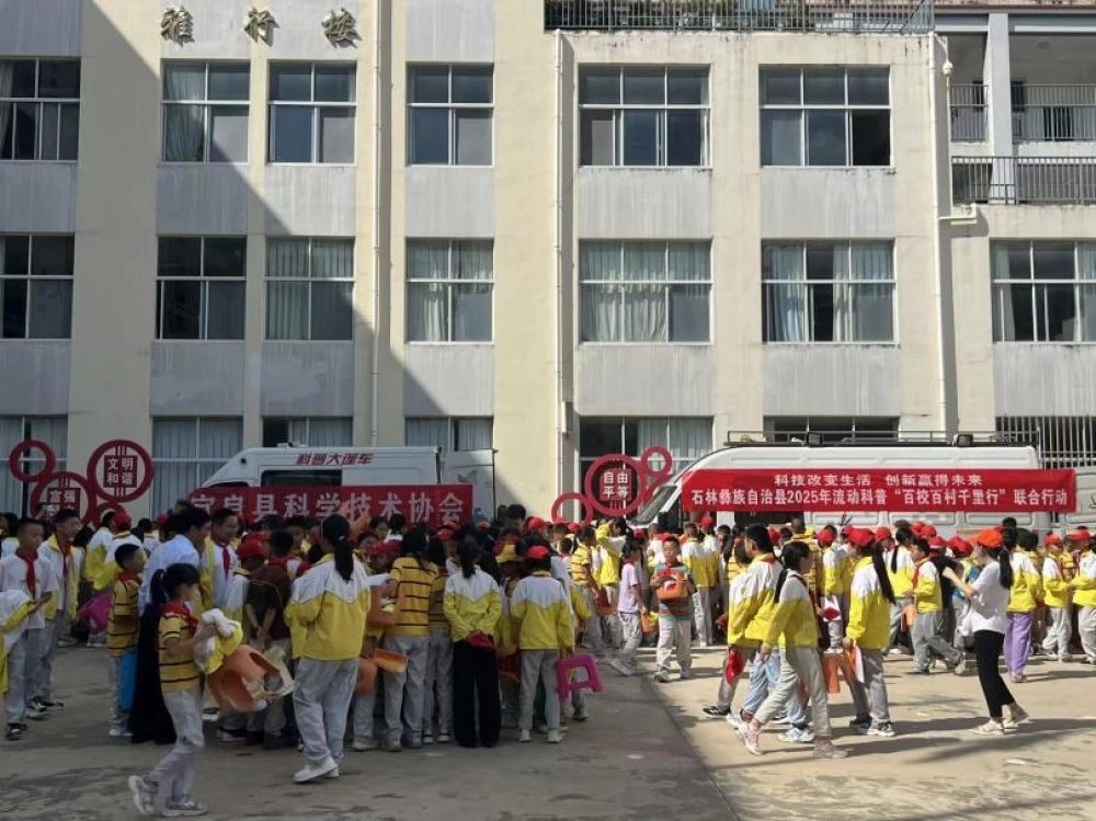 9月4日上午,由石林县科协联合宜良县科协、晋宁区科协共同组织的科普大篷车准时驶入石林县鹿阜小学,正式启动"科普惠民生 先锋在行动"联合巡展活动首站。作为全国科普日系列活动的开场之站,本次活动旨在通过沉浸式科普体验,在校园内营造讲科学、爱科学、学科学、用科学的浓厚氛围。