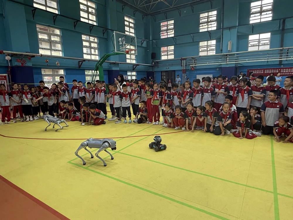 科普体验互动环节,现场设置三大“科学打卡点”:科普展品体验区提供机器狗、机器人、机甲战车互动展示,学生可亲手操作,感受科技魅力;趣味互动游戏区通过“知识产权拼图”“合力筑塔”等游戏,让学生在游戏中解锁科学原理;科普赛项挑战区则推出 “垃圾分类飞行棋游戏”“下棋机器人”“脑机接口”、体验模拟探索等项目,鼓励学生动手实践、大胆探索。
