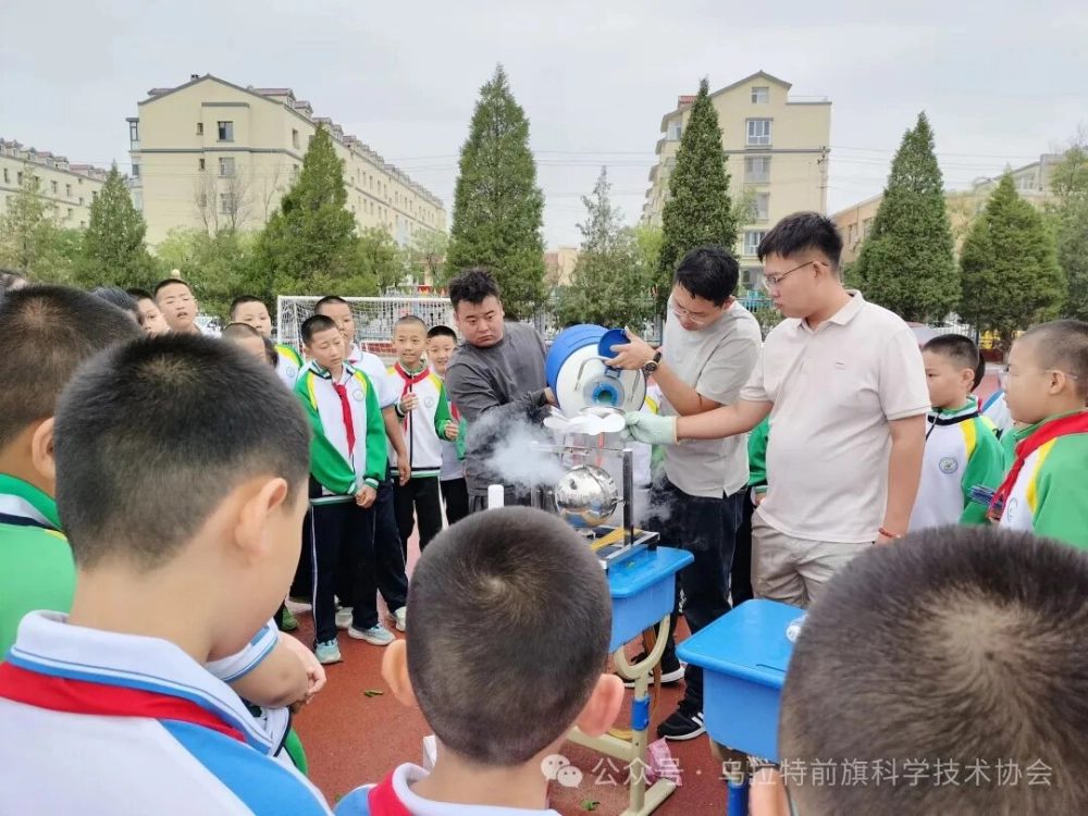 仪式结束后,市、旗两级共26家单位、7所学校以及8所科技类校外培训机构共同发力,围绕活动主题开展多元化科普活动。一是通过悬挂条幅、展示展板、发放宣传手册等方式,向现场师生普及科技发展动态、前沿知识及生活实用技能,助力科学素质提升;二是带领医疗团队通过现场健康咨询、基础检查等方式,传播科学养生与疾病预防理念;三是围绕应急避险、安全防护等主题开展实操演练,提升参与者自救互救的科学能力;四是通过操控无人机、机器狗、小胖机器人等智能产品进行特色展演,直观展现科技与强国建设的紧密联系;五是由校内外科技老师表演多场趣味实验秀,以互动实验演示科学现象,激发青少年对科技探索的兴趣;六是围绕“探索宇宙奥秘”这一主题,邀请30名学生进行现场绘画,彰显青少年科学想象力与创新思维;七是设计科普问答互动环节,让孩子们在趣闻问答中检验学习成果,增强参与感与获得感。