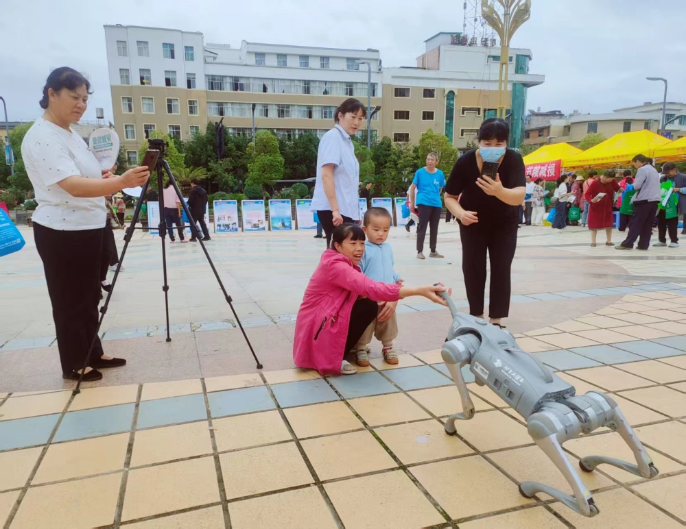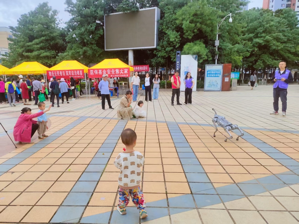 随后,澄江市科学技术协会带来的机器狗表演同样精彩。机器狗随着指令,做出行走、奔跑、跳跃等动作,甚至还能完成拜年、比心、握手、跳舞等软萌趣味动作,灵活的姿态让群众啧啧称奇,尤其是小朋友们,围在机器狗周围,好奇地观察、提问,在欢乐的氛围中激发了对科学的浓厚兴趣。