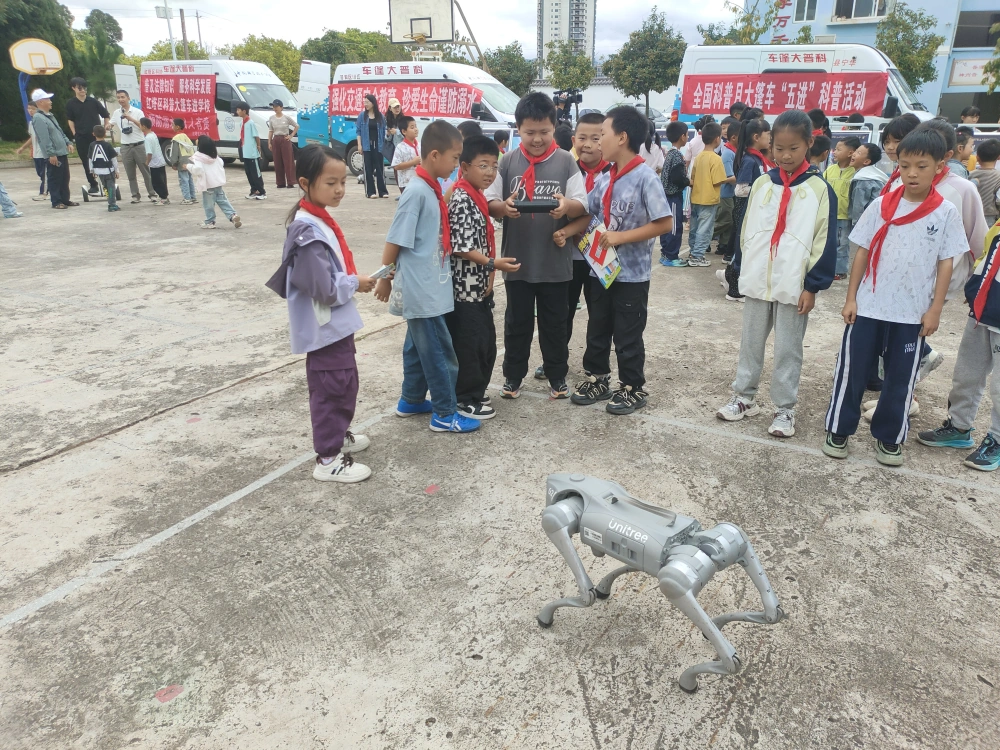 2025年9月12日,一场别开生面的科普活动在九溪镇中心小学和九溪镇中学精彩上演。科普大篷车驶入校园,带来了丰富多样的科普展教设备、3D展板、机器狗表演等内容,为1472名学子呈上了一道科技大餐,共发放宣传资料1384份。