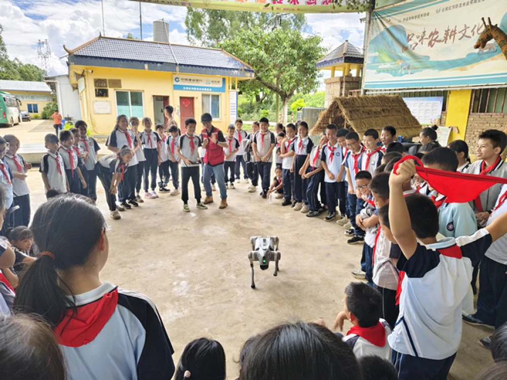 亲手操作机器狗,探索科技乐趣。开远市科普大篷车的到来首先为同学们简单演示了机器狗的操作,之后指导学生进行实操体验。互动环节非常热烈,同学们争先恐后地尝试操作,在动手实践中感受科技乐趣,欢声笑语充满了整个场地。实践过程中,老师适时提问,引导同学们思考,大家积极响应,踊跃回答。