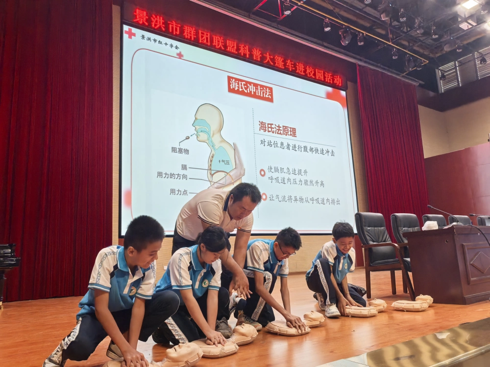 活动现场,市科协与市红十字会形成高效联动,构建起 “科技赋能 + 实操教学” 的双重科普体系:市红十字会培训讲师以理论讲解与实操演示相结合的方式,系统普及红十字运动发展历程、心肺复苏标准操作流程、气道异物梗阻急救技巧(海姆立克法)、鼻出血快速处理等实用急救知识,还通过急救模拟人道具,手把手指导学生进行实操练习,逐一纠正动作细节,确保每位参与学生都能掌握规范操作,真正实现 “学得会、用得上”;市科协则紧扣 “急救与气候变化” 主题,充分发挥科普资源优势,协助播放极端天气灾害科普视频、展示图文并茂的 PPT 资料,与红十字会讲师共同针对景洪地区常见的雷电、冰雹、暴雨等极端天气,详细讲解预警信号识别方法、户外及室内防灾避险要点、灾后自救互救流程等知识,进一步填补师生在极端天气应对领域的知识空白,有效提升了校园整体应对突发安全事件的综合能力。