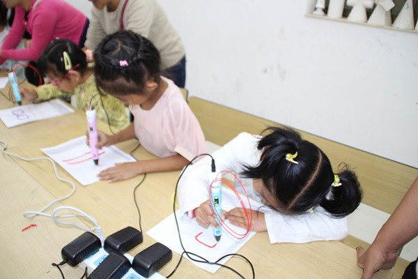 活动分版块进行,在3D创客体验活动现场,23名孩子在老师和家长的帮助下用3D打印笔绘出自己的作品。在牛顿摆实验现场,22名孩子分组进行牛顿定律的探索,通过自己动手,寻找能量守恒的原理。
