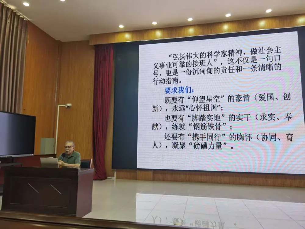 与此同时,科尔沁区科协邀请内蒙古民族大学教授、通辽市关工委副秘书长蒋极峰为同学们作科学家精神专题讲座。蒋教授借助图文展板和视频资料,生动讲述了钱学森、于敏等科学家的奋斗历程与崇高品格,引导同学们学习他们的爱国情怀、创新精神与求实作风。讲座现场互动频繁,气氛热烈。