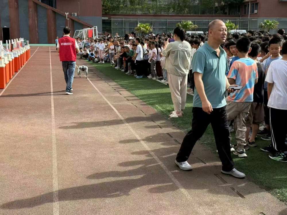 首先,机器人表演为活动拉开了序幕,音乐初启,如电子脉冲微微跳动,仿佛数字心脏悄然苏醒。随后,主旋律如电流般窜出,机器人们的关节同时发出清脆的“咔嗒”声,十六支机械臂以完全一致的角度抬起,跟随节奏翩翩起舞,机器人表演吸引了众多学生的目光,现场欢呼和掌声不断。机器狗的登场更是将现场气氛推向了高潮,它的每一个动作都引得全场尖叫连连,欢呼不断,学生们零距离感受到了人工的魅力和现代科技的力量。