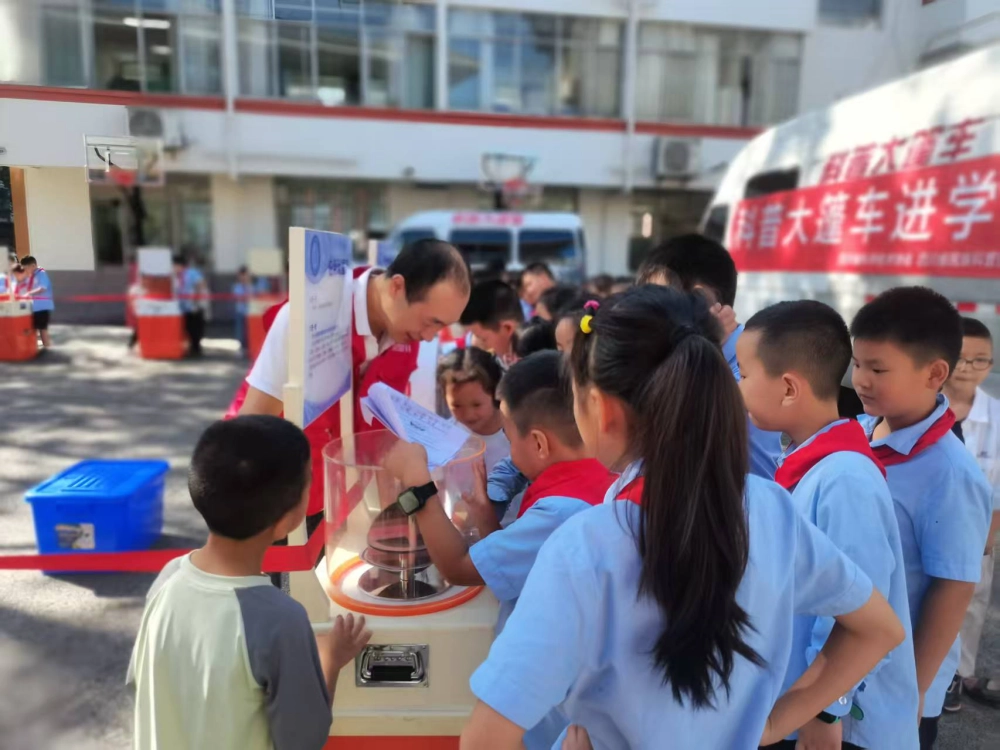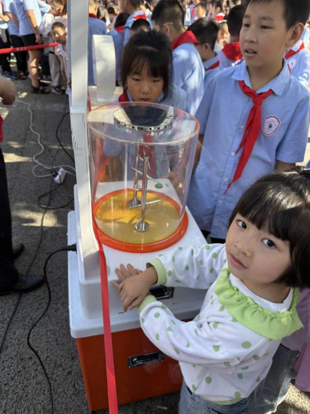 随后,多辆科普大篷车发挥“流动科技馆”的作用,在学校操场开展科普展示与互动体验:大篷车携带了包括“尖端放电”、“旋转的银蛋”、“翻转的镜像”、“磁力传动摆”、“锥体上滚”等二十多件涵盖力学、电磁学、光学、物理学等多个学科领域的互动展品,孩子们通过亲手操作和观察,在趣味体验中直观了解科学原理,激发探究欲望。