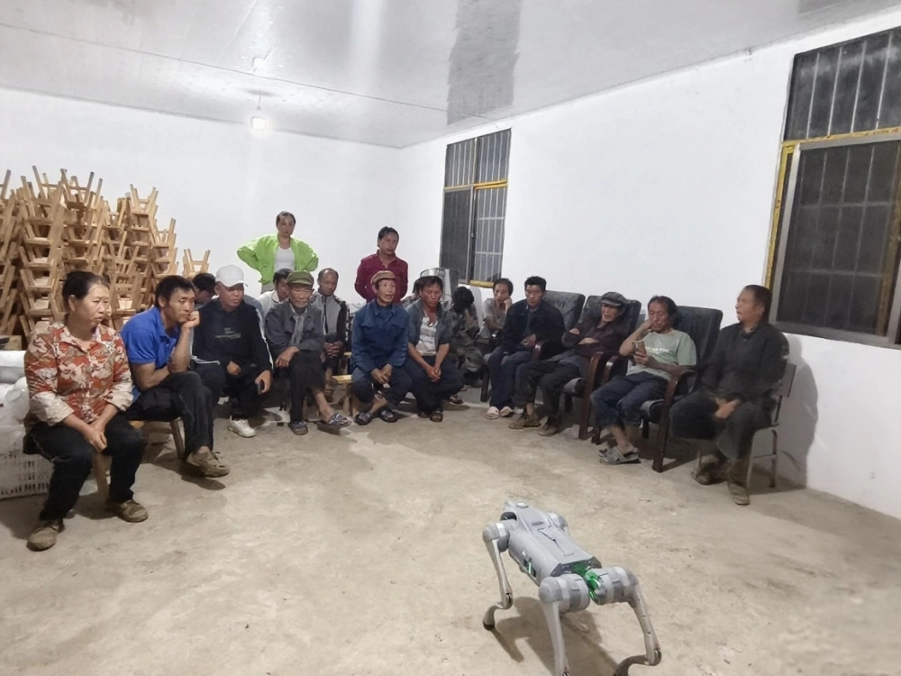 村民们围坐一起观看“机器狼”的小伙伴——“机器狗”在人群中灵活穿梭,精准执行指令:时而拱手拜年,时而可爱比心,时而匍匐跳跃,时而后空翻,还不时跳一段动感舞蹈,甚至轻松“避让”,许多老人好奇地围上前提问,志愿者则用通俗易懂的语言讲解,让晦涩的知识变得亲切可感、深入人心。