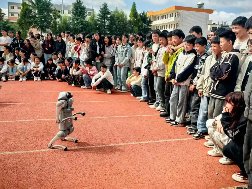 随后,操场中央的机器狗、机器人迅速成为“校园明星”。随着科普志愿者指令,机器狗灵活完成障碍跳跃、随乐转圈、模仿“挥手”等动作,机器人随音乐舞蹈,憨态模样搭配精准机械表现,瞬间吸引学生围拢欢呼。