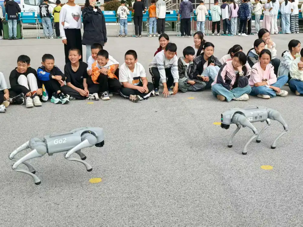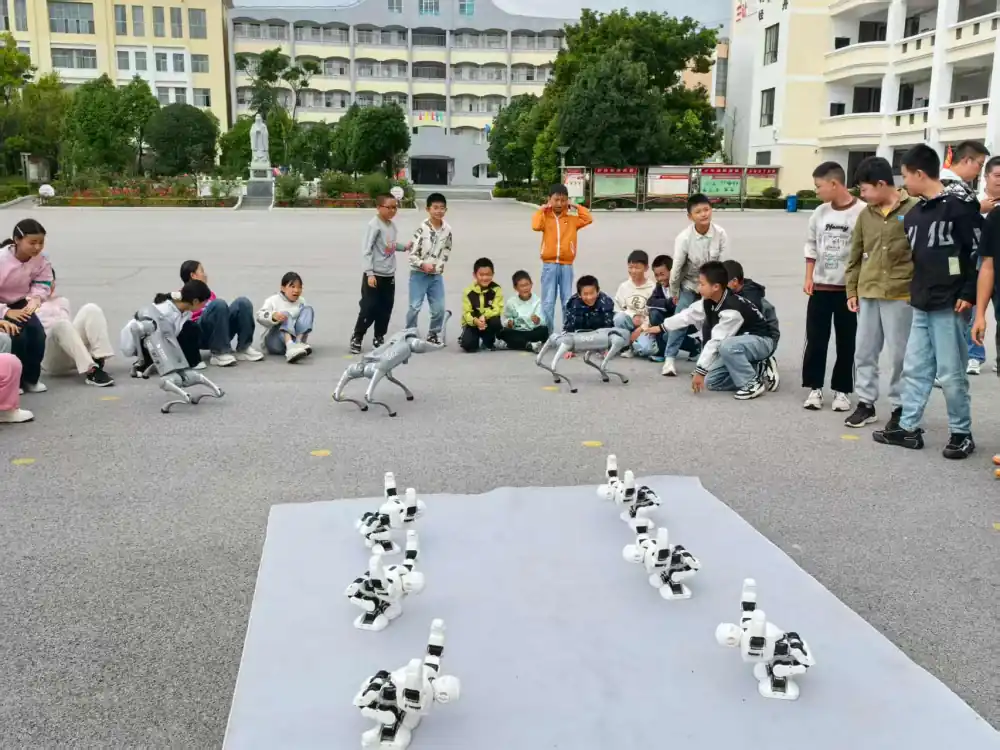 “快看!小机器人还会倒立呢”“哇!它还会后空翻!”一阵阵惊呼和掌声从马龙区通泉中学的操场传来。活动现场,八台人形机器人与四只机器狗闪亮登场。它们随着音乐手舞足蹈,动作整齐划一,流畅而富有节奏感。