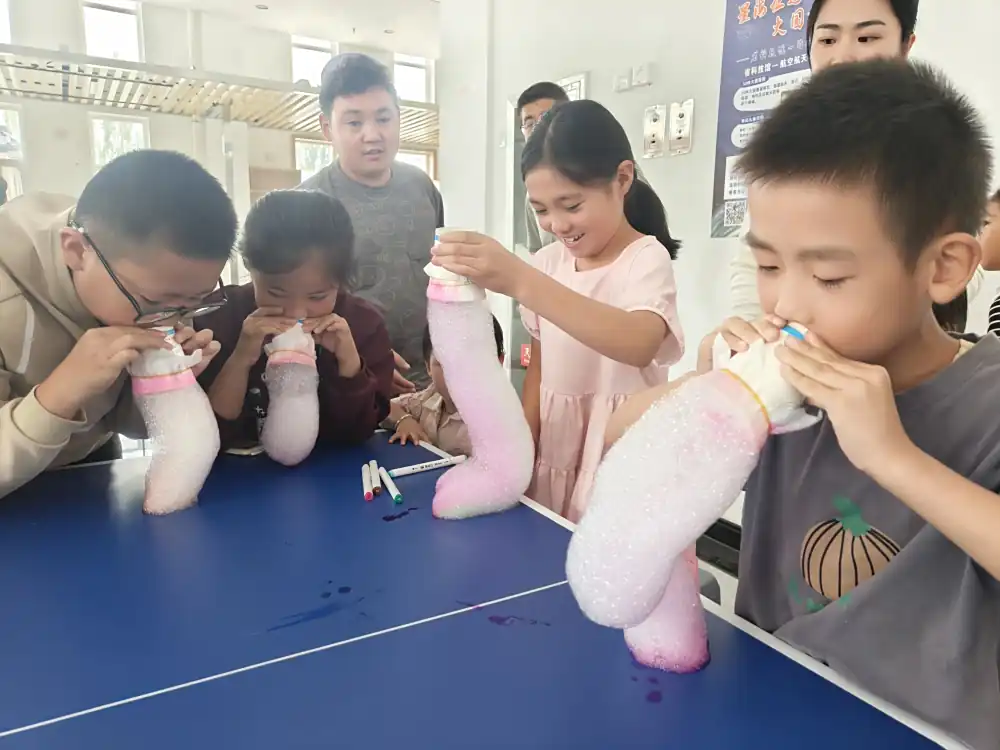 随后的科学小实验“彩虹泡泡龙”更是将活动推向了高潮。讲解员详细介绍了实验所需的材料,如洗脸巾、皮筋、彩笔、纸杯筒和洗洁精等,并逐步演示了实验步骤。小朋友们积极动手参与,当他们通过吹气,看到一条条色彩斑斓的泡泡龙从纱布中涌现时,兴奋地欢呼起来。在实验过程中,小朋友们还积极举手回答问题,与讲解员热情互动,现场气氛十分活跃。