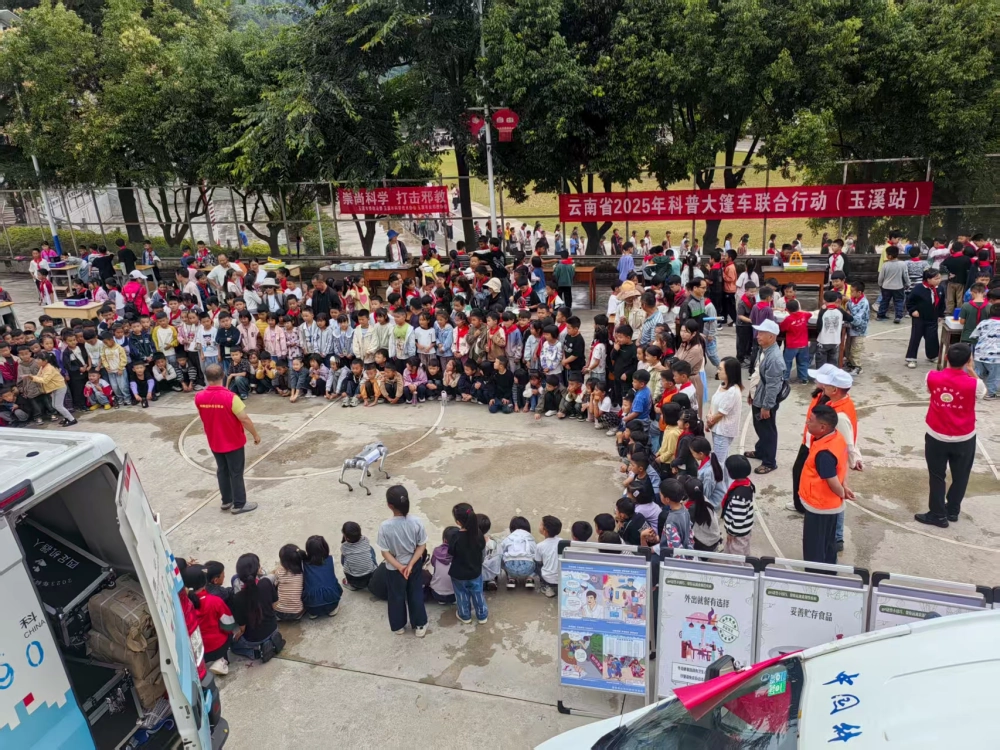 在首个全国科普月期间,为广泛宣传新修订的《中华人民共和国科学技术普及法》,深入实施全民科学素质行动,大力弘扬科学精神和科学家精神,推动科学普及与科技创新密切协同发展。9月9日,来自玉溪、曲靖、红河、保山、文山、香格里拉等州市/县科协的科普队员30余人,在云南省少数民族科普工作队贾队长率领下,携科普大篷车抵达玉溪市通海县,开展以“科普赋能乡村兴 科技筑梦彩云南”为主题的科普大篷车联合行动。在通海里山中心小学科普活动:展出特色科普器具70余件,机器狗3只、3D科普展板20余块,科普大篷车列队宣传《科普法》0.5小时。发放科普读物(科普知识读本、中小学生防溺水和交通安全知识、反邪教知识等)共1800余份(册)。