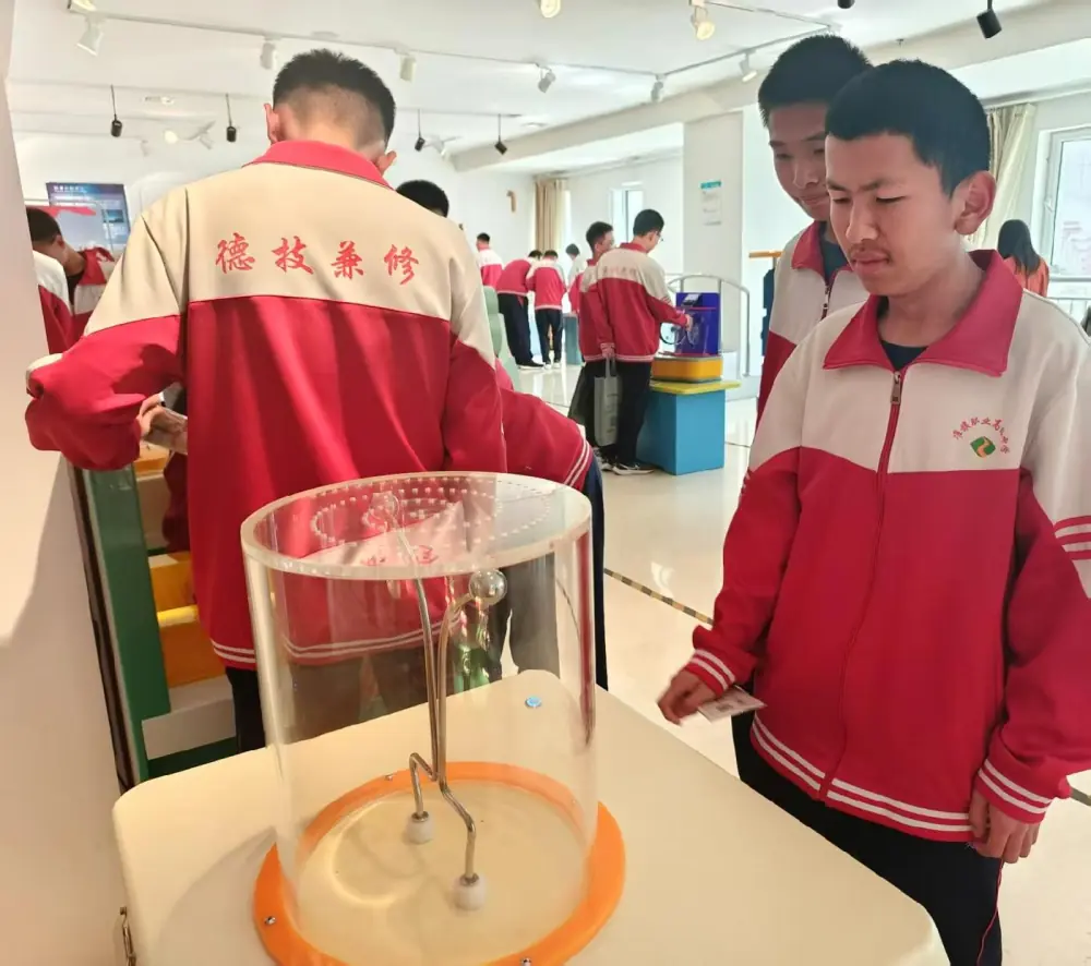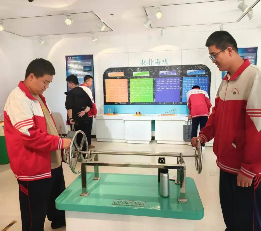 答题结束后,学生们有序进馆参观体验。在风力发电仪器前,大家饶有兴致地了解风力发电的原理与应用;混沌摆仪器旁,同学们驻足观察,感受着混沌现象的奇妙;模拟开车仪器前,大家排队体验,在虚拟驾驶中学习交通知识与机械操控的关联;比力气仪器处,同学们纷纷上前一试,在趣味互动里直观感受力量与机械的关系。