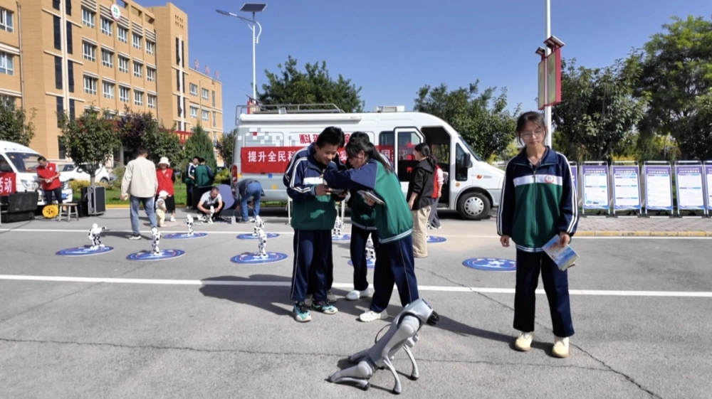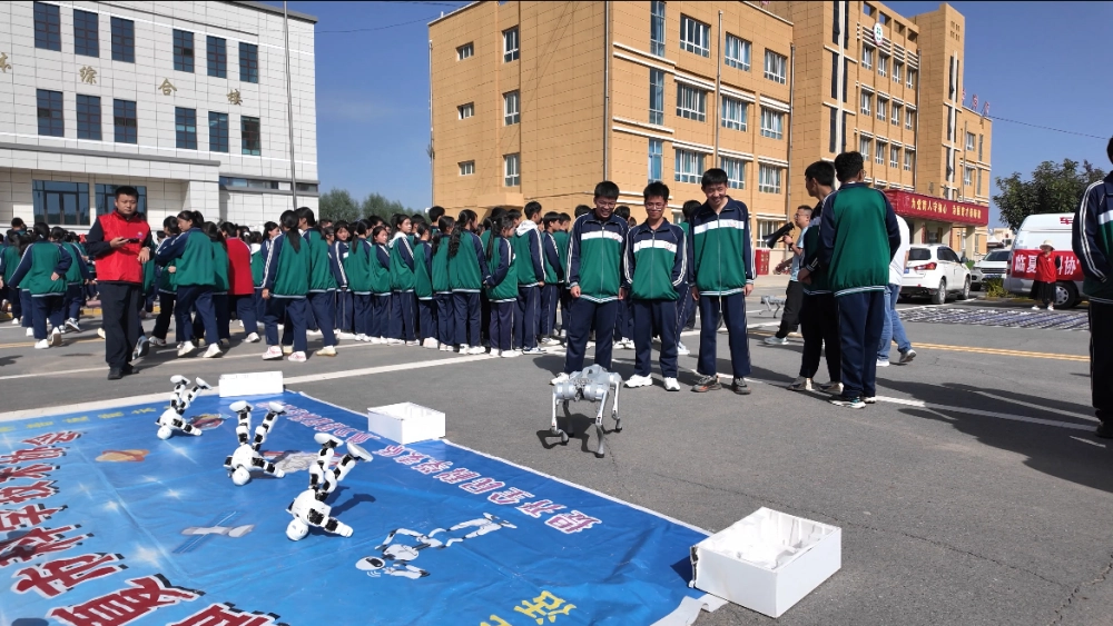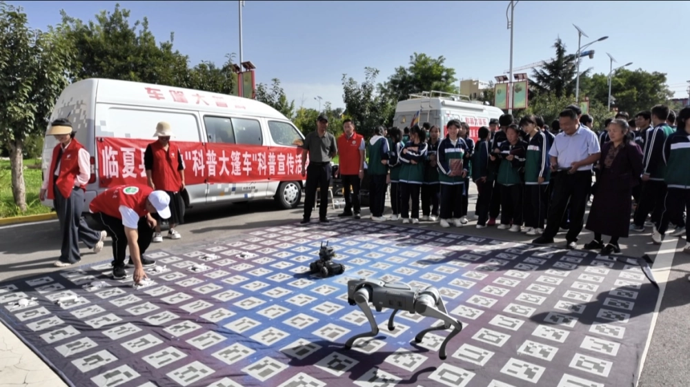 仪式现场,临夏县科普大篷车停靠在校园广场,车载的无人机演示和机器人、机器狗表演吸引了大批学生排队参与。