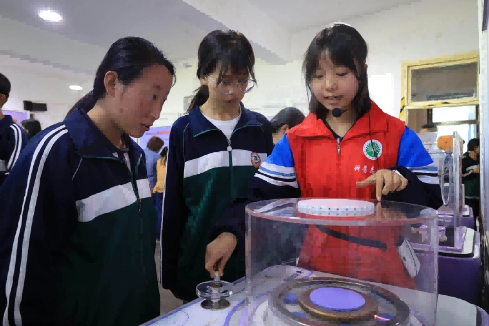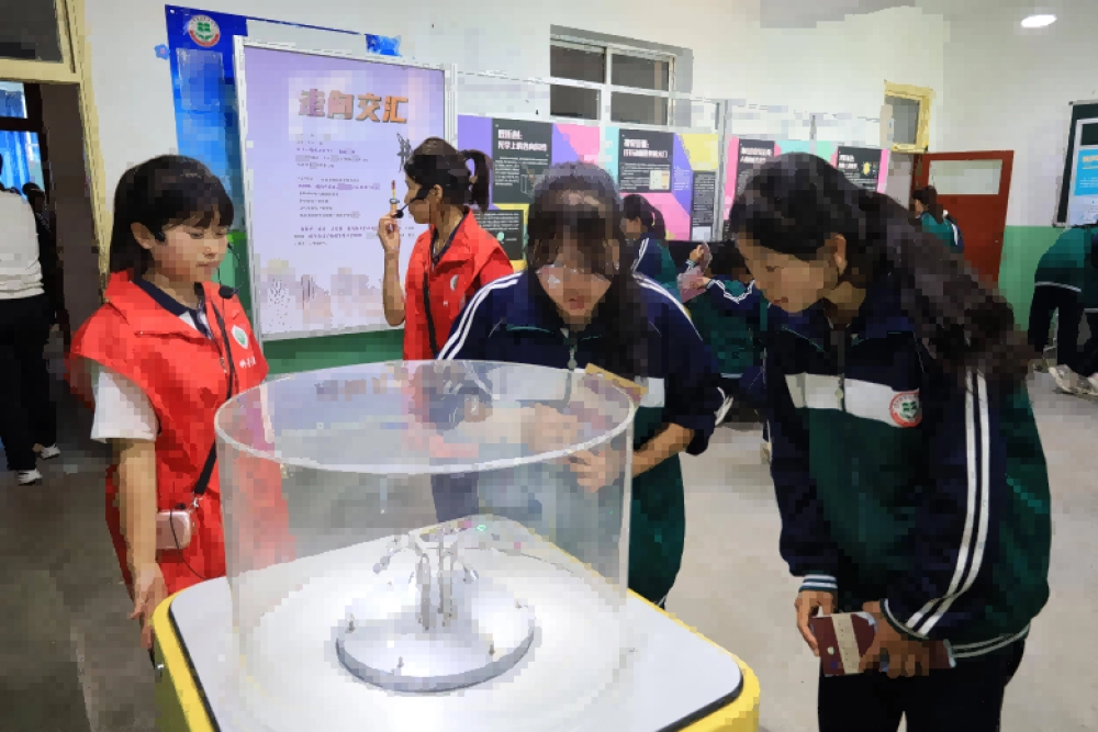 活动现场亮点十足,展品整齐排列,60 余件互动展品涵盖声光电互动、电磁探秘、数学魅力等多个领域,搭配机器人表演、VR 互动、无人机操作演示等项目,将抽象科学知识转化为直观体验,打造出一个充满趣味与思考的科学空间。尤为亮眼的是,活动前期经临夏县科协与学校联合选拔培训的10 名学生展品志愿讲解员,身着统一志愿服,分散在各个展品区域,化身 “小小科普使者” 开展生动讲解。他们提前熟悉每一件展品的原理、操作方法及背后的科学故事,面对同学的提问时,既用 “为什么按下按钮,灯光会跟着声音节奏变化?” 的提问式开场引发兴趣,又结合课本知识通俗解读 “这是利用了声音的振动频率转化为电信号,再控制灯光开关”;遇到操作不熟练的同学,还会手把手指导调整操作角度,耐心讲解 “你看,把这个滑块移到中间,电磁圈的吸引力最强,小铁球就能稳稳吸住”。