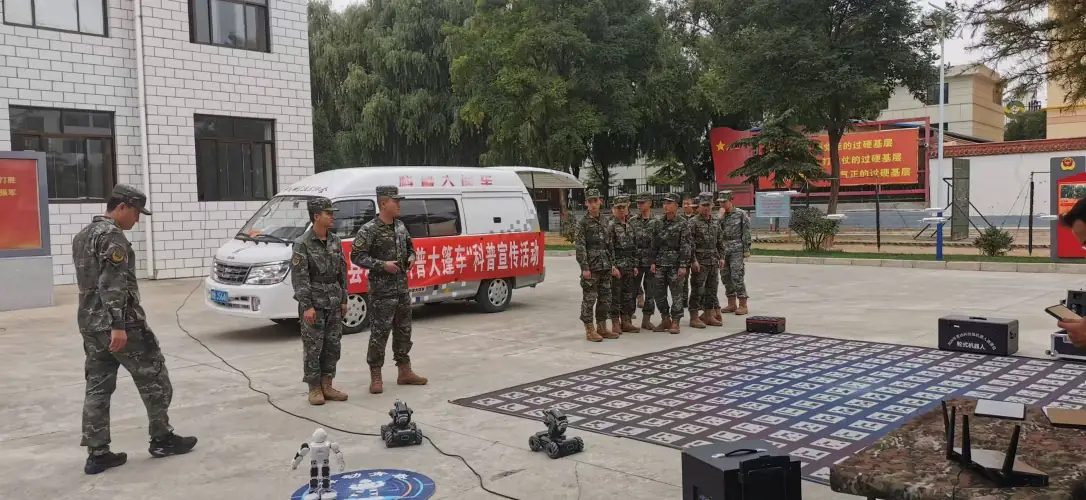 大讲堂结束后,科普大篷车展区成为官兵们的 “打卡地”。临夏县科协工作人员与技术志愿者分工协作,现场展示并指导操作机器狗、轮式机器人、无人机等前沿科普展品。一位士兵在操作机器狗后兴奋地说:“这些设备的操作逻辑和我们训练用的装备有共通之处,今天学到的技术思路,说不定能用到日常训练里!”