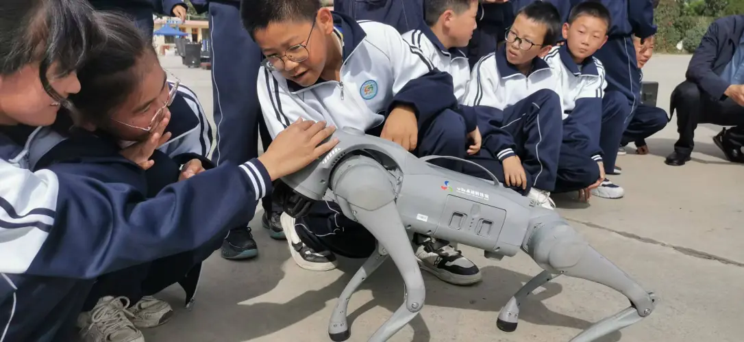 同时,临夏县科协的科普大篷车也成为活动的一大亮点。车载的机器狗、轮式机器人、编队无人机等科普设备一一亮相展示。机器狗灵活的动作、轮式机器人精准的操作以及编队无人机整齐有序的飞行表演,吸引了众多师生驻足观看。同学们纷纷上前,与这些科技设备进行互动体验,亲身感受科技的魅力与神奇。通过近距离接触,同学们不仅对人工智能技术有了直观的感受,更激发了他们对科学探索的热情。