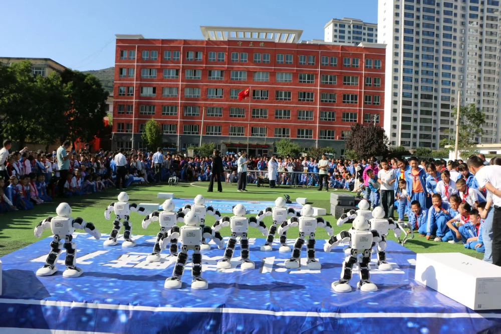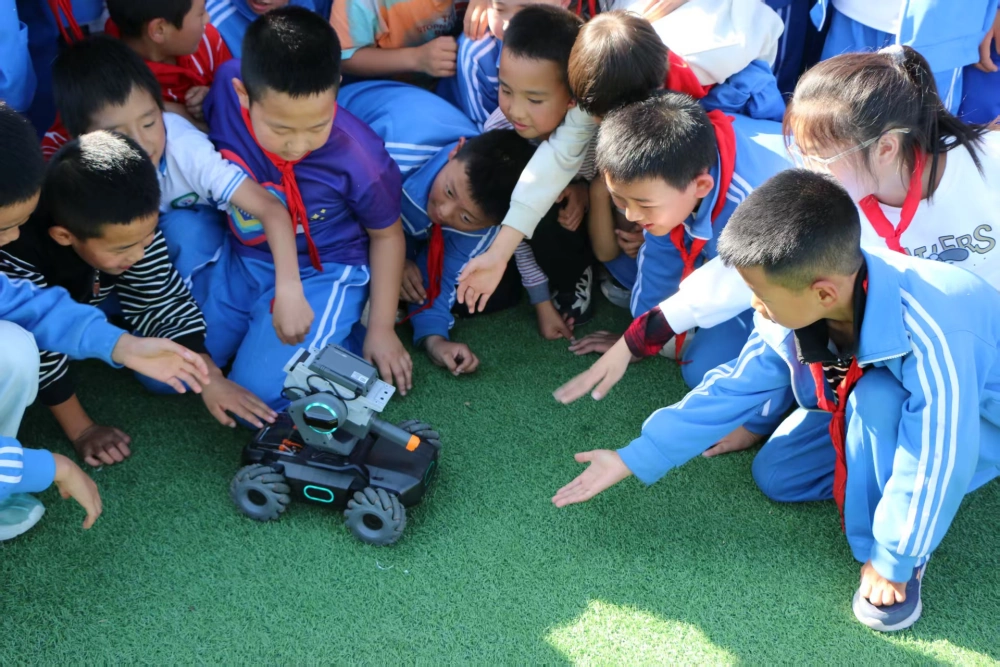 最受追捧的当属机器人表演。灵活的机器人跟着音乐起舞,还能通过指令完成“转圈”“挥手”,孩子们纷纷凑上前,有的想和机器人“握手”,有的好奇追问:“它为什么会听话?”志愿者用“讲故事”的方式解释:“机器人肚子里的‘大脑’是芯片,就像我们的小脑袋,能记住指令并完成动作。”