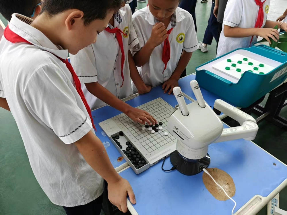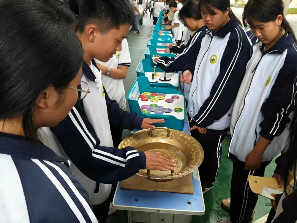 活动现场热闹非凡,学生们在各个展台前穿梭、驻足。在物理展区,那只古色古香的铜盆吸引了众多目光,当学生们将手放在盆沿轻轻摩擦,盆中水花随之跳跃,“声振原理”的奥秘在互动中被悄然揭开;数学展区的几何拼图前,同学们专注地尝试着不同形状的组合,在动手过程中领悟图形的奥秘;最具科技感的当属人工智能下棋机器人,它与学生们你来我往对弈,每一步落子都引发阵阵惊叹,让大家直观感受到人工智能的智慧。从低年级学生围着“彩虹水”实验的雀跃,到高年级学生探讨航天模型的专注,每个孩子都在沉浸式体验中,让科学知识不再是书本上的铅字,而是生动鲜活的探索乐趣。