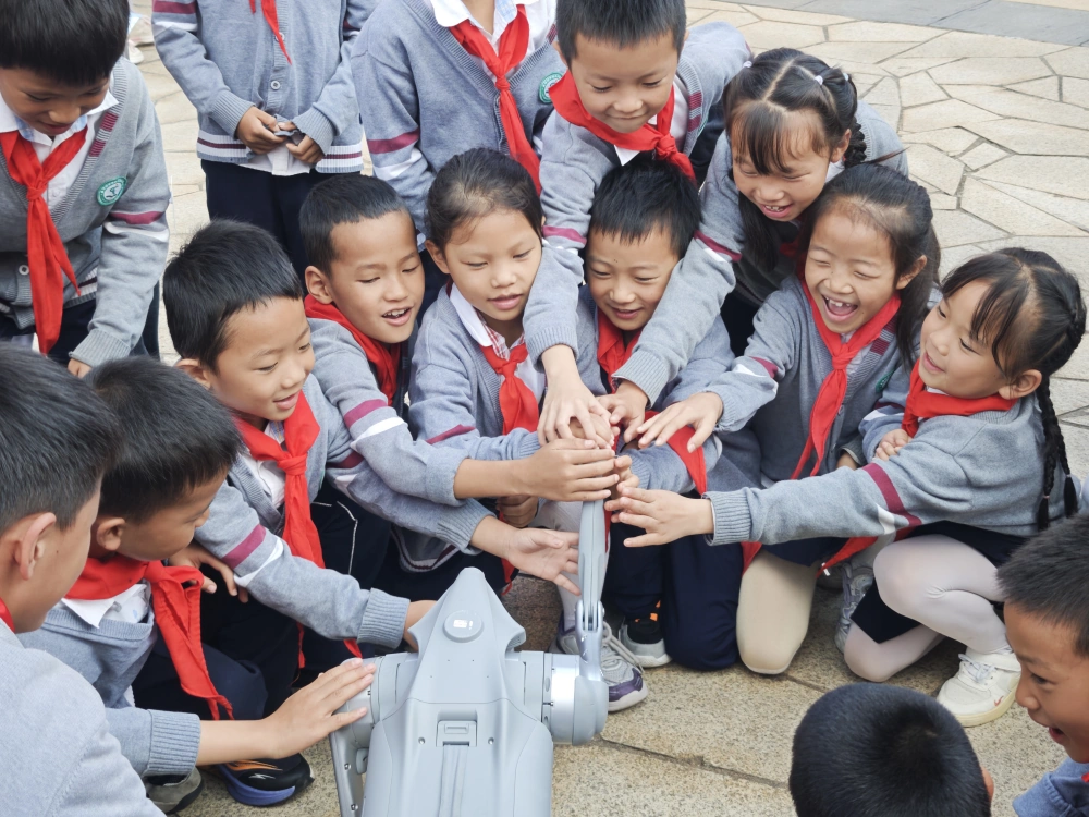 除了科普展品展示,机器人和机器狗舞蹈表演也成为活动焦点。智能机器人随着动感音乐节奏灵活舞动,做出各种笨拙又精准的动作,机器狗也不甘示弱,它们不仅能模拟真实宠物的行走、前跳、坐下、作揖等动作,还能根据指令完成复杂的舞蹈动作和前空翻,与机器人默契配合。现场学生们纷纷围拢过来,目不转睛地观看表演,欢呼声、掌声此起彼伏,不少同学还主动与机器人互动,询问关于人工智能的相关知识。