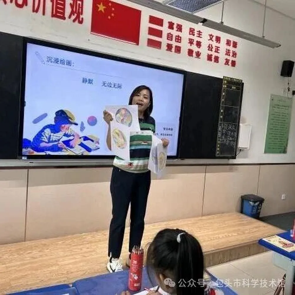 包头市心理协会的姚晓琴老师则为三年级12班的学生带来了一堂别开生面的心理咨询课——《色彩与心情的曼陀罗之旅》。课程以“你追我跑:纸上双人绘画”作为破冰环节,通过“秘密花园:曼陀罗涂鸦”和“沉浸式自由创作”等环节,引导学生用色彩表达情绪,在艺术创作中完成一场“内心探险”。孩子们在画笔与色彩的碰撞中,学会了感知自我情绪、释放压力,课堂氛围温馨而治愈。