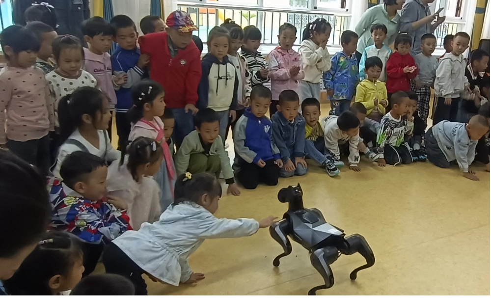 孩子们在志愿者的引导下,与机器狗进行了亲密互动,包括简单的声音指令互动、触摸感知等。