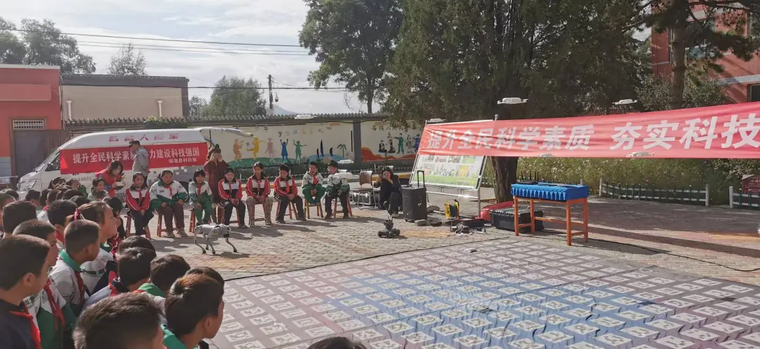 下午,科普大篷车驶入王坪小学,70 余名师生热情迎接。针对小学生的兴趣特点,工作人员在无人机、机器狗、智能机器人展示的基础上,增加了趣味问答环节。孩子们围绕基础科技常识积极抢答,答对的学生获得科普书签、科学实验套装等小奖品,现场气氛热烈。