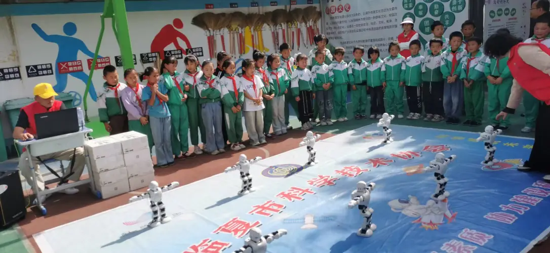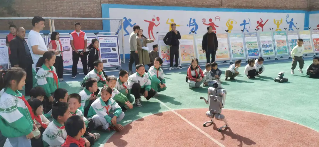 在拜家小学,400 余名师生齐聚操场,迎接 “科普大篷车” 的到来。活动伊始,无人机编队在空中灵活穿梭,时而变换队形,时而完成俯冲、旋转等高难度动作,引得学生们欢呼连连。机器狗在工作人员的操控下走步、跳跃、握手,憨态可掬的模样让孩子们忍不住上前互动。