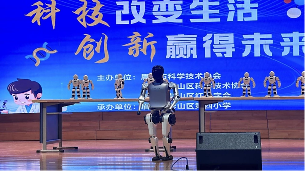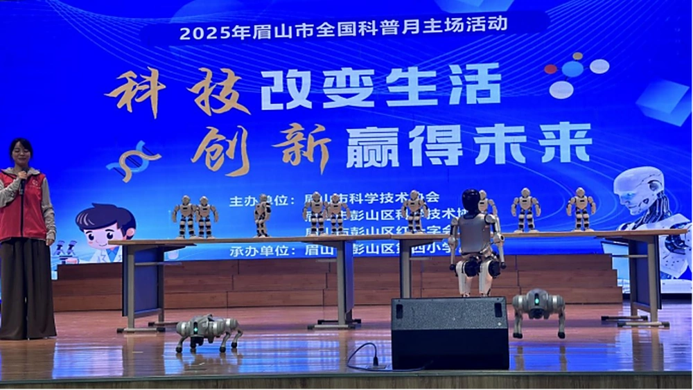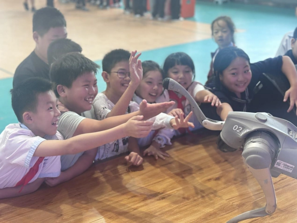 紧接着,机器狗闪亮登场。四川若创科技的老师播放欢快的音乐,引导学生们大声歌唱,同时现场展示操作机器狗,让学生们直观感受科技的奇妙。机器狗灵动的身姿,做出各种高难度动作,如跳跃、翻滚等,进一步激发了学生们对科技的浓厚兴趣。