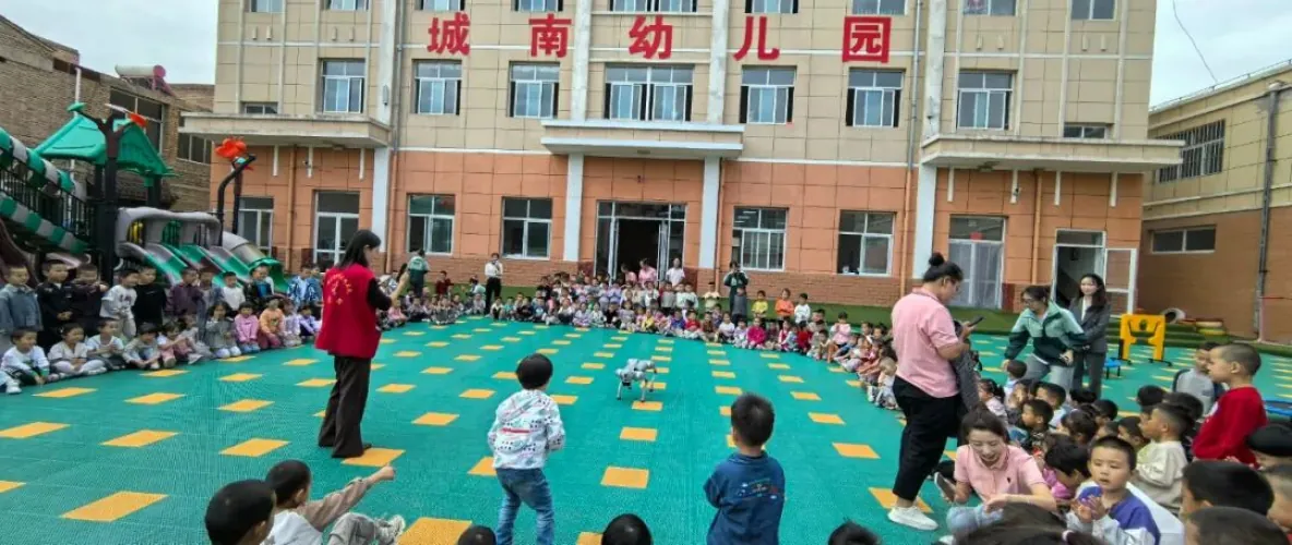 “机器狗表演”更是精彩一幕,让孩子们近距离接触了科技的“可爱一面”。机器狗伴随着音乐做出前进、转弯、跳跃等动作,灵活的姿态仿佛在和孩子们互动。孩子们围在周围,兴奋地和机器狗“打招呼”,好奇地追问“它为什么会动”,现场充满了欢乐与探索的氛围。