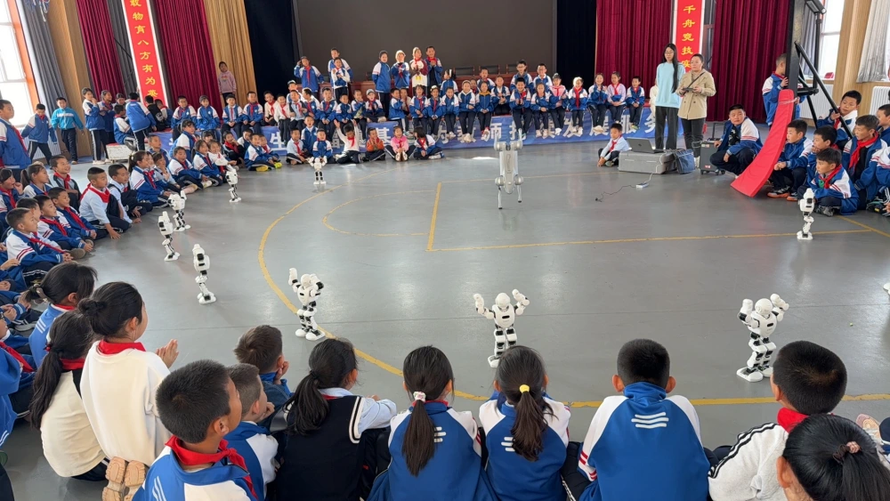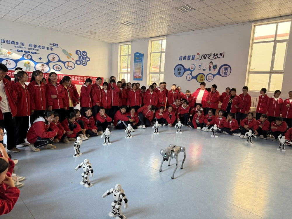 此外,风雨活动室内的科技表演同样精彩纷呈,跳舞机器人随着欢快的音乐节拍,灵活完成旋转、摆臂、踏步等动作,精准卡点的舞姿引得同学们纷纷模仿;机器狗则化身“舞蹈小能手”,在指令操控下做出跳跃转身、跟随节奏摇摆等灵动动作,憨态可掬的模样让现场笑声不断;最引人注目的当属编程无人机表演,无人机伴随音乐节拍变换队形、穿梭盘旋,宛如“空中舞蹈家”,全方位展现科技的创新力量,让同学们近距离体验前沿科技成果,树立科技报国的远大理想。