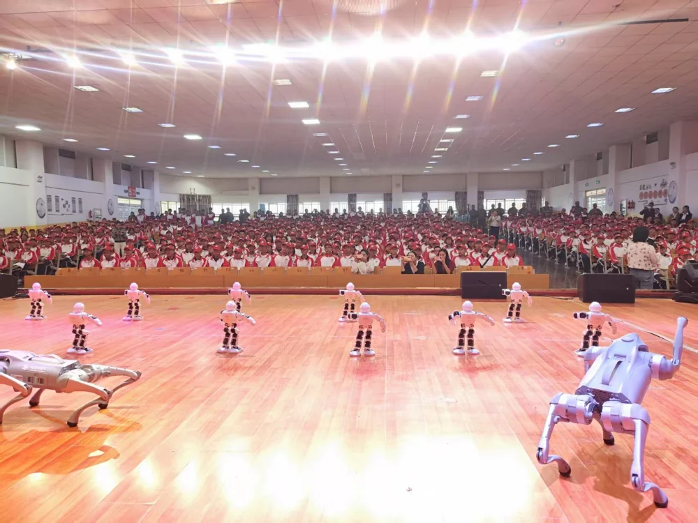 活动现场,最吸睛的当属机器人与机器狗的精彩表演。伴随着动感音乐,机器人灵活舞动,流畅完成旋转、踢腿等高难度动作,精准卡点的街舞表演瞬间点燃现场气氛,同学们的欢呼声此起彼伏。一旁,机器狗也不甘示弱,摇头摆尾、伏地探步,时而做出敏捷的跳跃动作,憨态可掬又科技感十足,走道里,机器狗与同学们互动握手,大家好奇地观察这些智能小家伙的运作细节,直观感受人工智能与机械科技的奇妙融合。