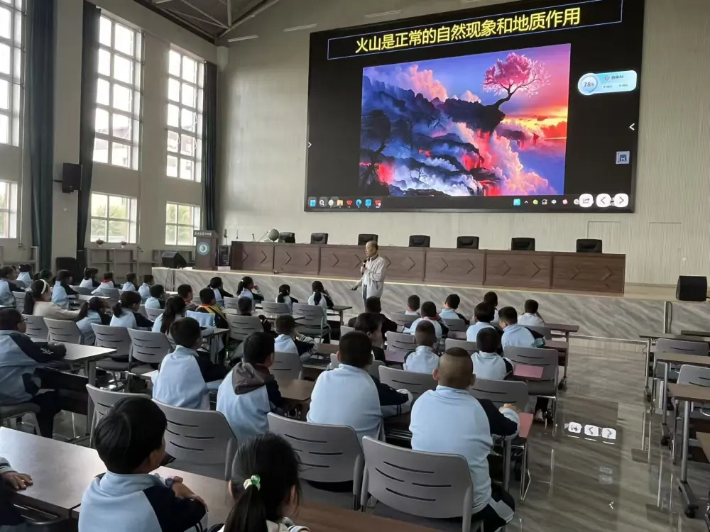 县第四小学的科普讲座主题为《地球:火山的故事》。国老师从火山的形成原理讲起,延伸到火山喷发的过程、火山的类型与全球分布,还通过动画演示让抽象的地质知识变得易懂。课堂上,他频繁与学生互动提问,孩子们踊跃举手,对勇于回答的学生,老师还当场赠送纪念品,让课堂氛围持续升温。